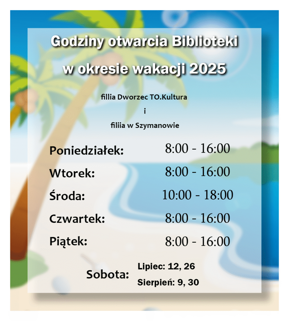 Aktualności Godziny pracy w wakacje Opublikowano 25-06-2025 UWAGA, WAŻNA INFORMACJA Zbliżają się wakacje, w związku z tym filia w Szymanowie oraz Filia Dworzec TO.Kultura będą otwarte w godzinach : poniedziałek, wtorek, czwartek , piątek 08-16 środa 10-18. soboty: lipiec : 12 oraz 26, sierpień: 9 oraz 30