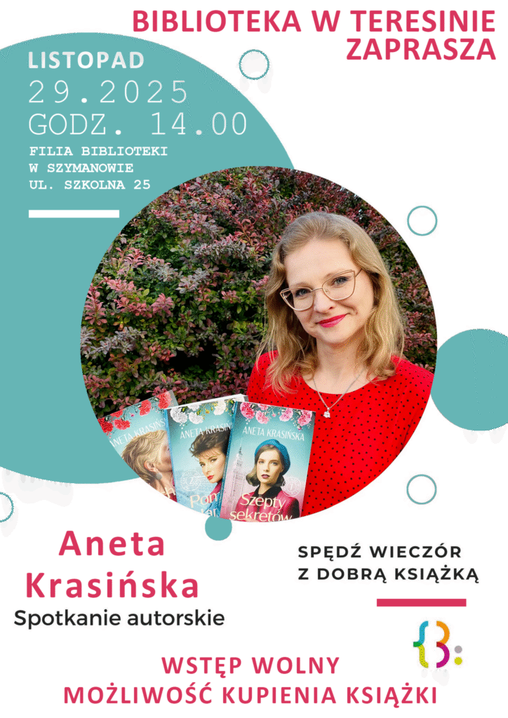 Serdecznie zapraszamy na wyjątkowe spotkanie autorskie z Anetą Krasińską – pisarką, która w swoich książkach z niezwykłą przenikliwością łączy emocje, codzienność i skomplikowane relacje międzyludzkie. Wydarzenie odbędzie się w filii w Szymanowie ul. Szkolna 25.