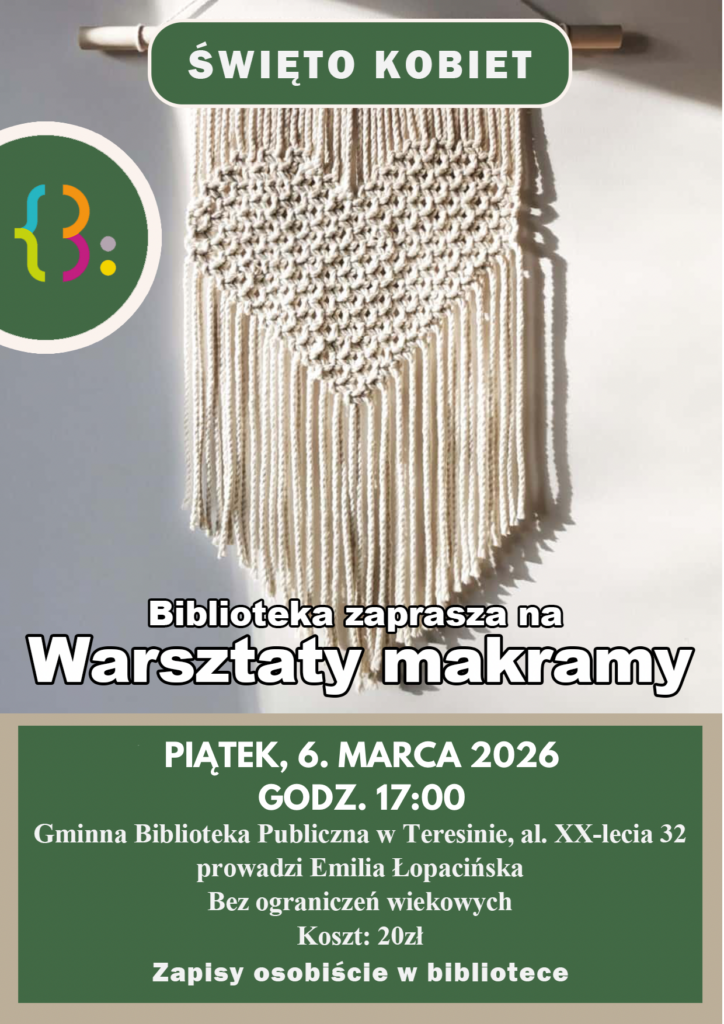 Serdecznie zapraszamy na wyjątkowe warsztaty z makramy organizowane z okazji Dnia Kobiet, które odbędą się w Bibliotece w Teresinie! 🧶💐