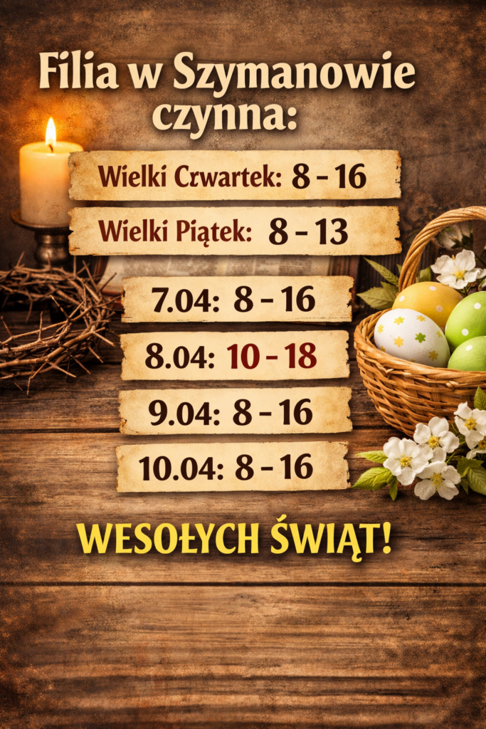 Aktualności Biblioteka Główna Filia Szymanów Filia TOKultura Plan pracy naszych gminnych bibliotek podczas zbliżających się Świąt Wielkiej Nocy Opublikowano 30-03-2026