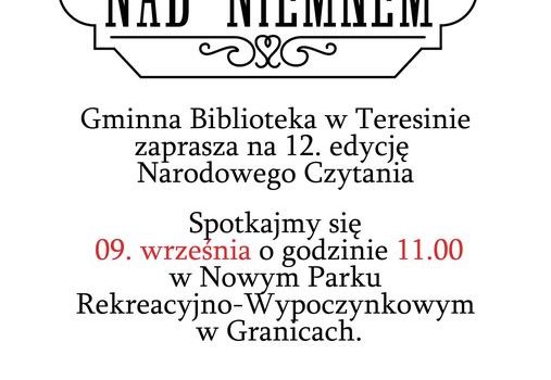 Zapraszamy w wspólnego czytania. To już dwunasta edycja Narodowego Czytania. Park wodny Grancie 09. września godzina 11.00 W programie wspólne czytanie tegorocznej lektury „Nad Niemnem”, przewidziano pamiątkowe egzemplarze książki dla uczestników wraz ze specjalnym stemplem oraz słodki poczęstunek. Serdecznie zapraszamy.