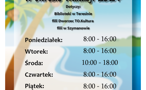 W dniu 29.08.2024 Biblioteka Główna (na stadionie) zamknięta. Zapraszamy do filii w Szymanowie i do filii Dworzec TO.Kultura.